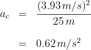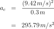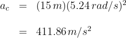 Una bicicleta gira en una pista círcular de radio 15 m, con velocidad angular de 5.24 rad/s. ¿Cuál es su aceleración centrípeta?