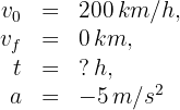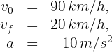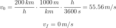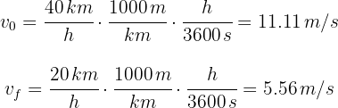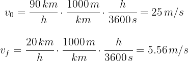 2Verificamos que se tengan las mismas unidades. Notamos que la velocidad inicial y final están dadas en kilómetros por hora, entonces las convertimos a metros por segundo
