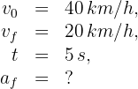 3Verificamos que se tengan las mismas unidades. Notamos que la velocidad inicial y final están dadas en kilómetros por hora y la aceleración en metros por segundos al cuadrado, entonces convertimos las velocidades a metros por segundo