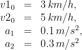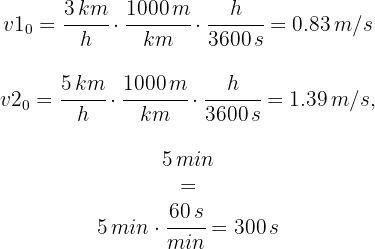 2Verificamos que se tengan las mismas unidades. Notamos que las velocidades iniciales están dadas en kilómetros por hora, entonces las convertimos a metros por segundo. También transformamos los minutos a segundos