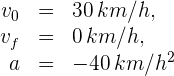 2Verificamos que se tengan las mismas unidades. Notamos que la velocidad está dada en kilómetros por hora y los resultados en metros por segundos al cuadrado, entonces la convertimos a estas unidades