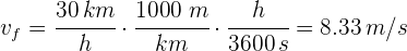 2Verificamos que se tengan las mismas unidades. Notamos que la velocidad está dada en kilómetros por hora y el tiempo empleado en segundos, entonces convertimos la velocidad a metros por segundos