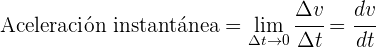 La aceleración instantánea se obtiene tomando el límite en la fórmula de velocidad promedio cuando