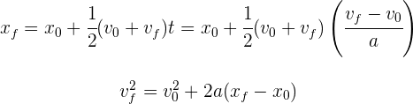 También podemos encontrar la velocidad final a partir de las velocidad inicial, la aceleración constante y la posición de la partícula sin contener el tiempo. Para esto sustituimos la expresión del tiempo de la fórmula de aceleración promedio, en la fórmula de la posición en término de sus velocidades inicial, final y el tiempo