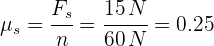 Un objeto de 60 N descansa sobre una superficie horizontal y requiere un tirón de 15 N para comenzar a moverse. Encuentra el coeficiente de fricción estática.