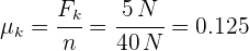 Un objeto de 40 N se mueve a velocidad constante sobre una superficie horizontal para lo cual requiere una fuerza tirón de 5 N. Encuentra el coeficiente de fricción cinética.