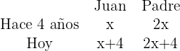 4Las edades son: Juan: 32 + 4 = 36. Padre: 2 · 32 + 4 = 68