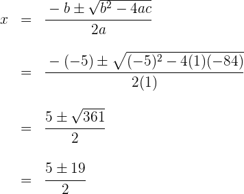 La suma de dos números es 5 y su producto es −84. Halla dichos números.