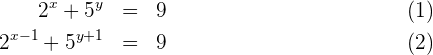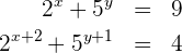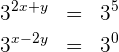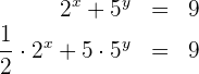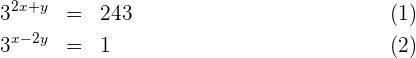 Este método es útil para resolver sistemas en las que los miembros del sistema exponencial tienen potencias con la misma base. Como se puede observar en el siguiente ejemplo: