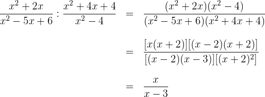 El cociente de dos fracciones algebraicas es otra fracción algebraica cuyo numerador es el producto del numerador de la primera por el denominador de la segunda, y como denominador el producto del denominador de la primera por el numerador de la segunda