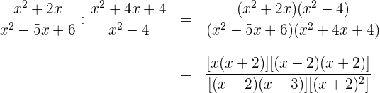 En el numerador sacamos factor común en el primer binomio y la diferencia de cuadrados la trasformamos en un diferencia de cuadrados. En el denominador el trinomio de segundo grado lo descomponemos resolviendo la ecuación de segundo grado que resulta de igualarlo a cero y el trinomio cuadrado perfecto lo transformamos en un binomio al cuadrado