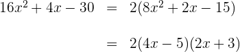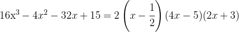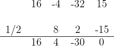 Entonces las posibles raíces racionales serán los divisores del término independiente (Divisores de 15: ±1, ±3, ±5, ±15) entre los del término de mayor grado (Divisores de 16: ±1, ±2, ±4, ±8, ±16)