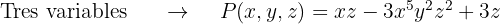 Un polinomio puede tener varias variables. En este caso, los monomios, de manera análoga, cuetan con un coeficiente y varias variables cada una con un respectivo exponente. Por ejemplo