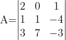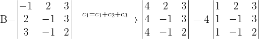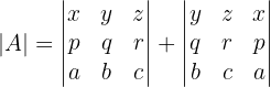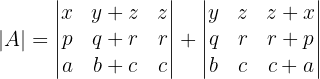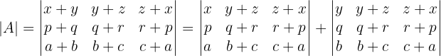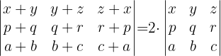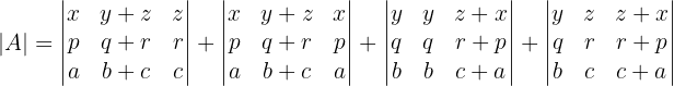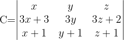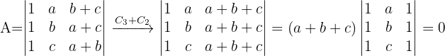 Notamos que la tercera columna es igual a la suma de las otras dos, así que su determinante es 0.