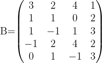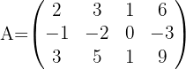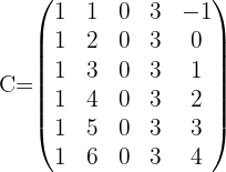 Eliminamos la tercera columna por ser nula, la cuarta por ser proporcional a la primera, y la quinta porque combinación lineal de la primera y segunda: