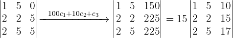 No nos interesa saber el valor exacto de la última matriz, pues sabemos que debe ser un número entero y que al multiplicarse por el 15 de la izquierda, el determinante de resultará un múltiplo de 15