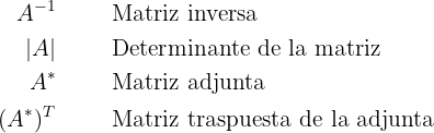 4  La matriz inversa es igual a la transpuesta de la matriz adjunta entre el determinante de la matriz original:  Esto es,