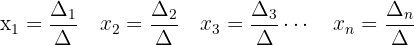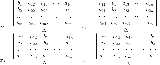Y sean los determinantes que se obtiene al sustituir los coeficientes del 2º miembro (los términos independientes) en la 1ª columna , en la 2ª columna, en la 3ª columna y en la enésima columna respectivamente. Entonces las soluciones del sistema de ecuaciones están dadas por la siguiente relación: