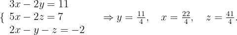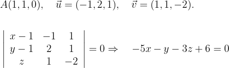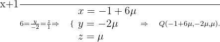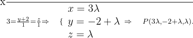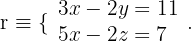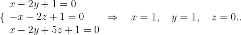 Después podemos considerar una de las ecuaciones definitorias de la recta para construir un sistema de tres ecuaciones con tres incógnitas y calcular la intersección de los tres planos, es decir: