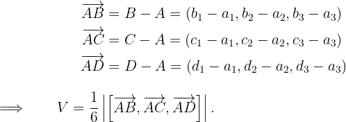 Por otro lado, si se tienen las coordenadas de los vértices del tetraedro, es posible conocer los tres vectores que lo forman y calcular su volumen: