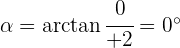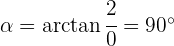 Este resultado no te lo dará la calculadora pues 2/0 no está definido, pero de manera intuitiva se menciona que es infinito y como tan 90 es infinito, entonces se deduce que arc tg de 2/0 es 90 grados, otra manera de deducirlo es geométricamente.
