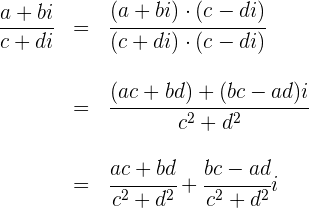 La división de dos números complejos expresados como fracción se efectúa multiplicando tanto el numerador como el denominador de dicha fracción por el complejo conjugado del denominador y, posteriormente, realizando las simplificaciones correspondientes hasta expresar el resultado de la forma