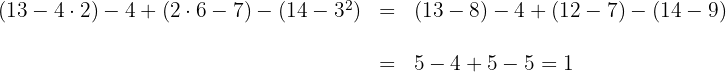 Realizamos las multiplicaciones, divisiones y las potencias, luego sumamos y restamos los elementos restantes
