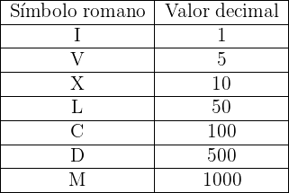 El sistema de numeración romano expresa los números por medio de siete letras del alfabeto latino como se muestra en la siguiente tabla: