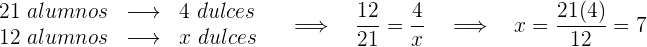 Se trata de una regla de tres inversa porque a menor cantidad de alumnos corresponde una mayor cantidad de dulces.
