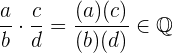 El producto de dos números racionales es otro número racional el cual tiene por numerador el producto de los numeradores y por denominador el producto de los denominadores. Esto es