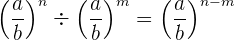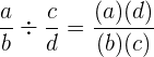El cociente de números racionales es otro número racional que tiene por numerador el producto de los extremos y por denominador el producto de los medios. Por ejemplo