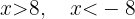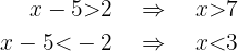 \[ \begin{align*} x - 3 > 4 \quad &\Rightarrow \quad x > 7 \\ x - 3 < -4 \quad &\Rightarrow \quad x < -1 \end{align*} \][/latex]