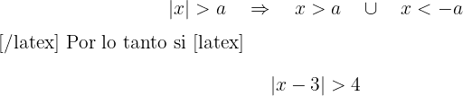 \[ |x| < a \quad \Rightarrow \quad -a \textless x \textless a \] [/latex] Por lo tanto si [latex] \[ |2x+ 18| \textless 2 \] [/latex] entonces [latex] \[ \begin{align*} -2 \textless 2x &+ 18 \textless 2 \\ -20 \textless 2&x \textless -16 \\ -10 \textless &x \textless -8 \end{align*} \][/latex] Es decir, son todos aquellos números que se encuentran entre [latex]-10[/latex] y [latex]-8[/latex] sin incluirlos.