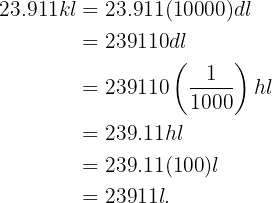 Tenemos que dl es una unidad menor que hl, por lo que para pasar de dl a hl es necesario dividir, se encuentran a tres espacios de diferencia, entonces se debe dividir entre 1000; por otro lado para pasar de hl a dal se debe multiplicar por 10 y finalmente para pasar de dal a cl es necesario multiplicar por 1000, es decir,