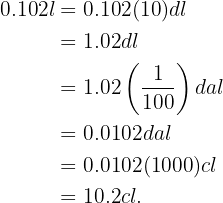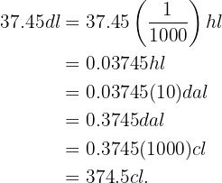 En este caso debemos pasar de l a dl, por lo que multiplicaremos por 10; después pasaremos de dl a dal por tanto dividimos entre 100 y finalmente pasaremos de dal a cl y para esto es necesario multiplicar por 1000,