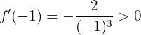 3 Formamos intervalos abiertos con la discontinuidad, en este caso no existen ceros de la derivada. Nos apoyamos con la representación de los puntos en la recta real