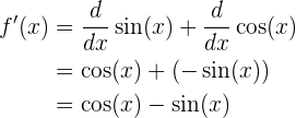 Notemos que tenemos tanto una suma como una resta, en este caso las derivadas de la suma se suman y las de la resta se restan. Las funciones involucradas son