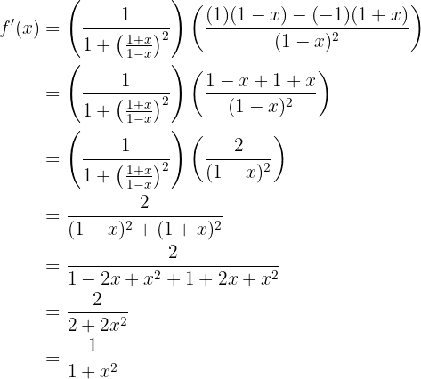La descripcion es erronea donde da la derivada de arcocotangente, ya que dice derivada de arcotangete, se comieron el co, lo que puede llevar a confunciones, como en mi caso que pense que era la derivada de la inversa de tangente, cuando era la derivada de la inversa de cotangente.