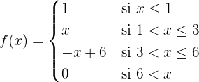 \displaystyle f(x) = \begin{cases} -x & \text{si } x < 0\\1 & \text{si } x = 0\\x & \text{si } 0 < x < 2\\1 & \text{si } x \geq 3\end{cases}[/latex]