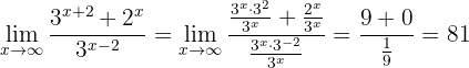son exponenciales, entonces podemos pensar que su grado siempre es mayor al de cualquier polinomio (formalmente se dice que una exponencial es de mayor orden que un polinomio). Si tanto el numerador como el denominador son exponenciales, entonces tendrá mayor orden la exponencial con la base más grande.