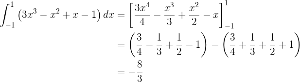 Encontramos la primitiva de cada una y calculamos la diferencia entre los valores -1 y 1