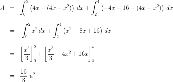4El área solicitada viene dada por en dos partes. En la primera la recta con pendiente positiva se encuentra por encima de la parábola y en la segunda la recta con pendiente negativa se encuentra por encima de la parábola
