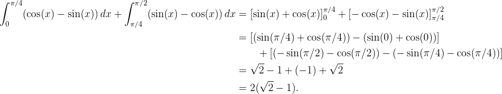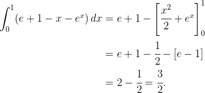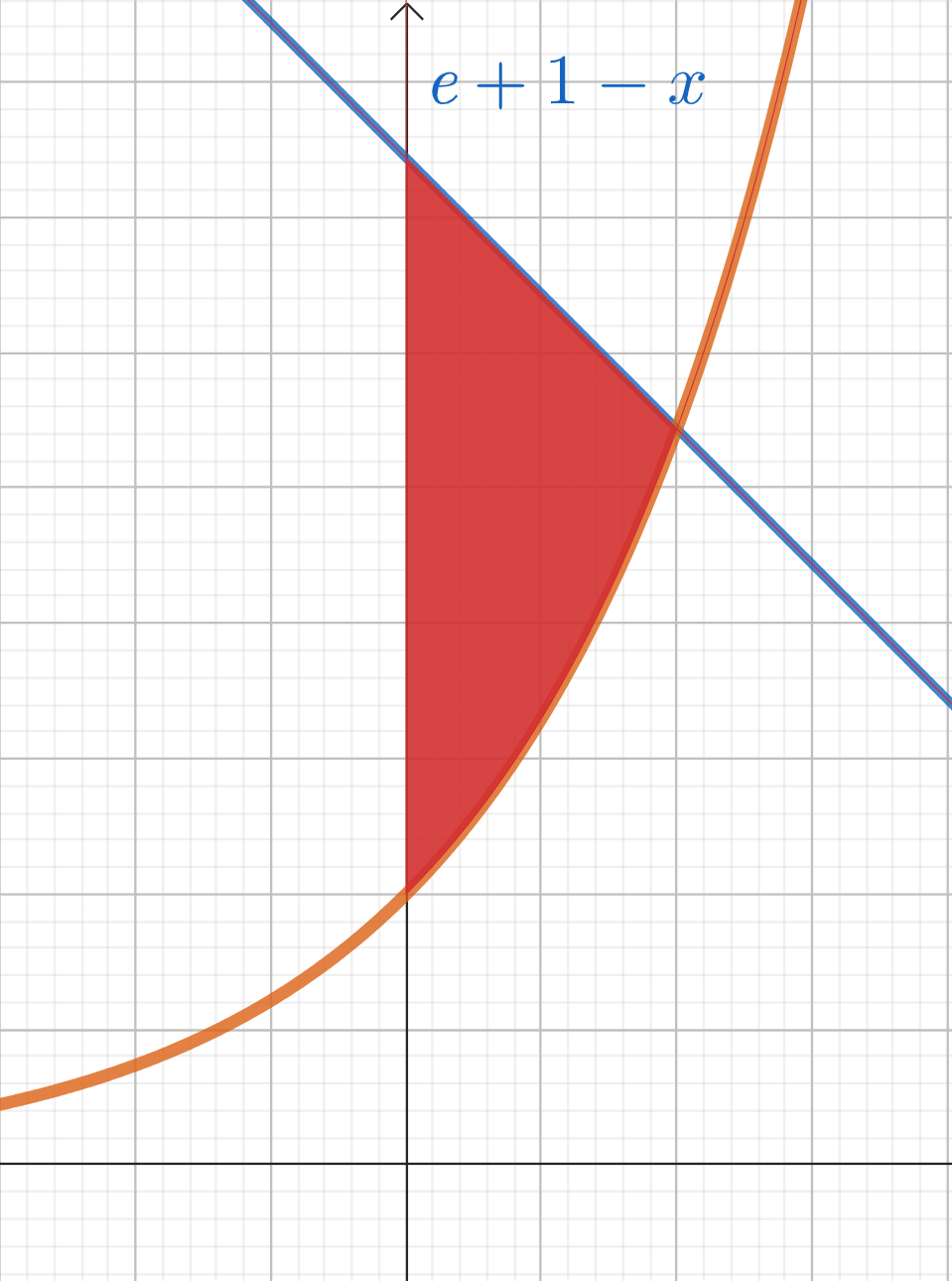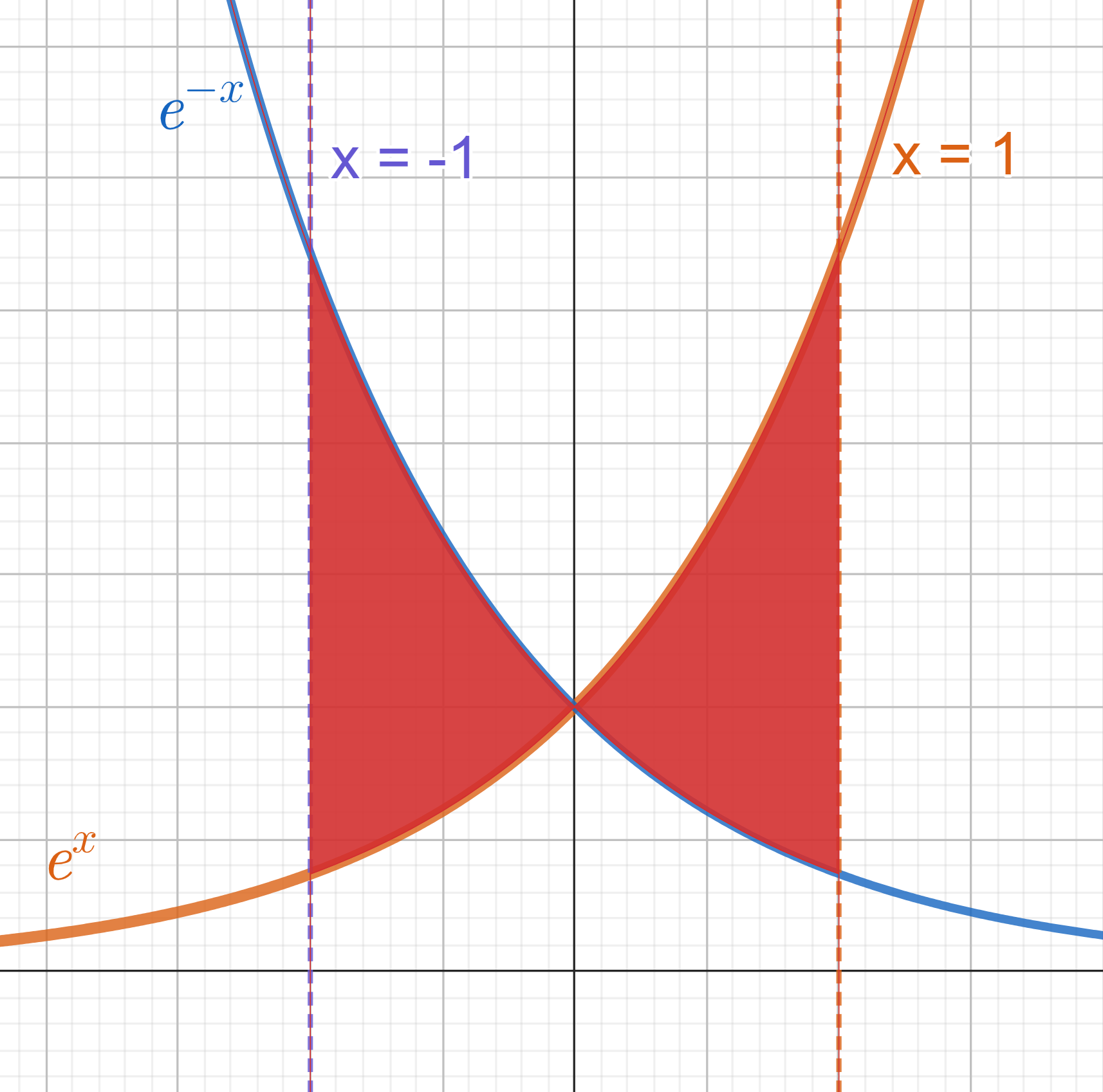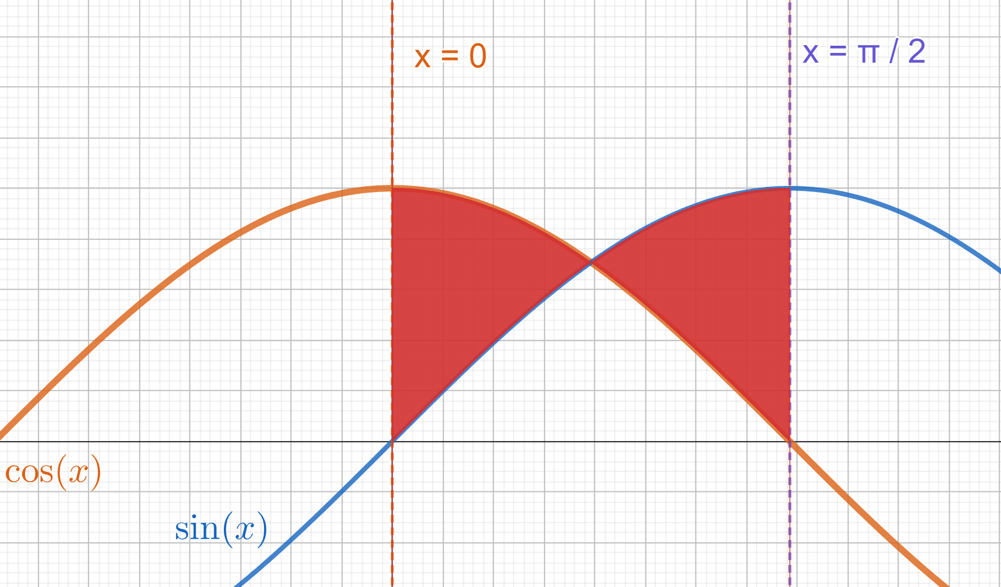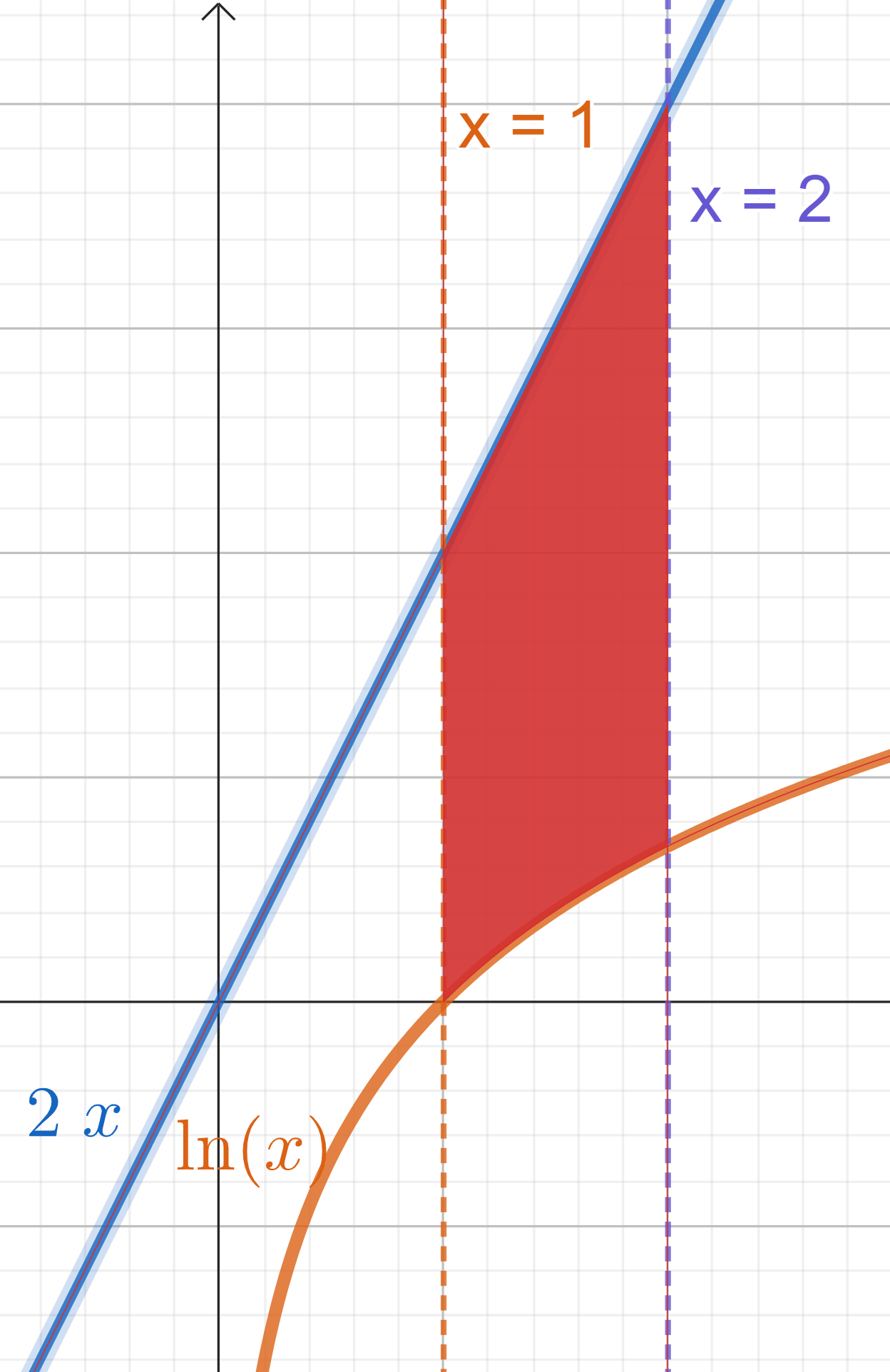 . Entonces, para calcular el área, debemos separar la integral en este punto, donde se encuentra el cambio de la función dominante (la que tiene el valor más grande).