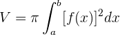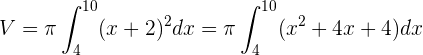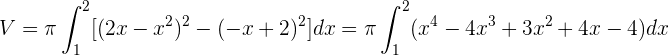 La parábola está por encima de la recta en el intervalo de integración, entonces al sustituir los valores en la fórmula del volumen, tenemos: