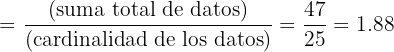 En la tabla anterior, en la última fila se encuentran las suma totales de las columnas. Esto quiere decir que 25 representa la cardinalidad del conjunto de datos y 47 es la suma del total de datos. Teniendo esto en cuenta, calculamos el promedio de la siguiente manera.