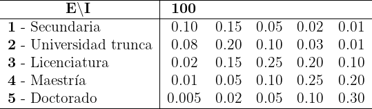 La siguiente tabla muestra la relación entre el nivel máximo de estudios de un individuo y la probabilidad que tiene de estar en un rango de ingresos anuales (en miles de dólares)