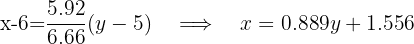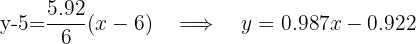 y – 5 = (5.92 / 6) * (x – 6) >>> y = 0.987 * x – 0.922