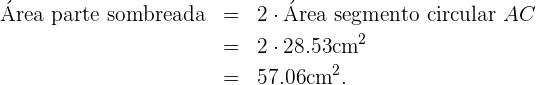 La parte sombreada es el área que queremos calcular. Observe que, el área sombreada se compone de dos segmentos circulares idénticos. Luego, solo hace falta calcular el área de uno de ellos y después multiplicar el resultado por dos.