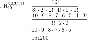 El número de permutaciones con repetición de elementos donde tres de ellos se repiten una vez, dos de ellos se repiten dos veces y uno tres veces es: