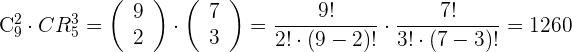 Tenemos la multiplicación de una combinación y una combinación con repetición, utilizamos la correspondiente fórmula en cada caso y multiplicamos